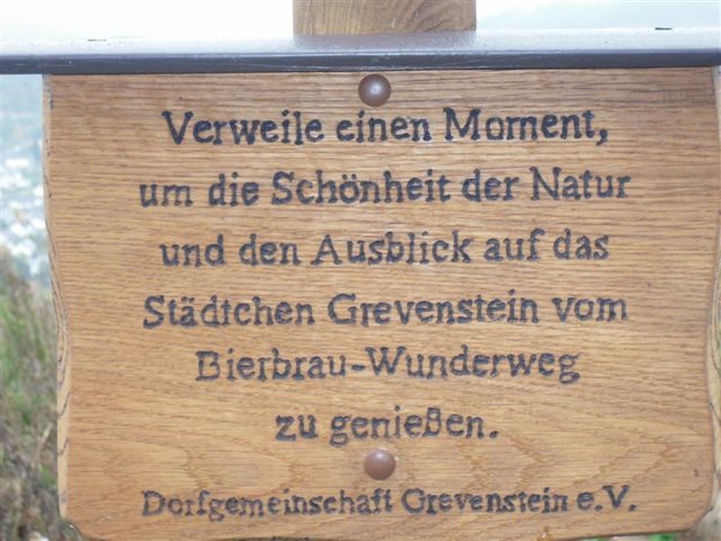 Wir haben uns mit 6 Personen in Meschede getroffen und sind mit Fahrgemeinschaften nach Grevenstein zur Schützenhalle gefahren. Gegenüber der Schützenhalle startet der Wanderweg Bierbrau-Wunderweg Grevenstein. Wir sind den Rundweg, mit den 10 Stationen, ganz gewandert. An den Stationen werden das Bierbrauen und die Geschichte über das Bier dargestellt. Auf dem Wanderweg hat man schöne Aussichten. Am Ende der Wanderung haben wir im Cafe Franzes uns den Kuchen schmecken lassen.
